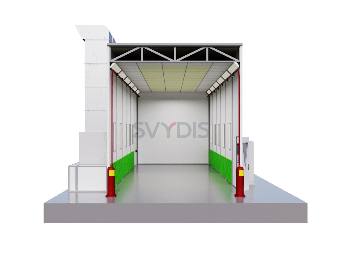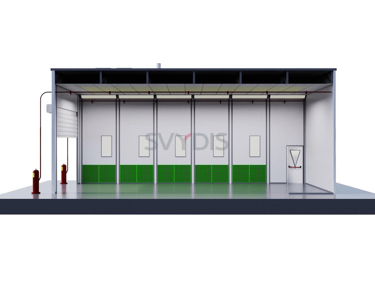 Окрасочно-сушильная камера тупикового типа для прицепов и полуприцепов предназначена для подготовки поверхности, обеспыливания, обезжиривания, маскировки, а также нанесения на изделия лакокрасочных покрытий и их сушке при повышенной температуре.