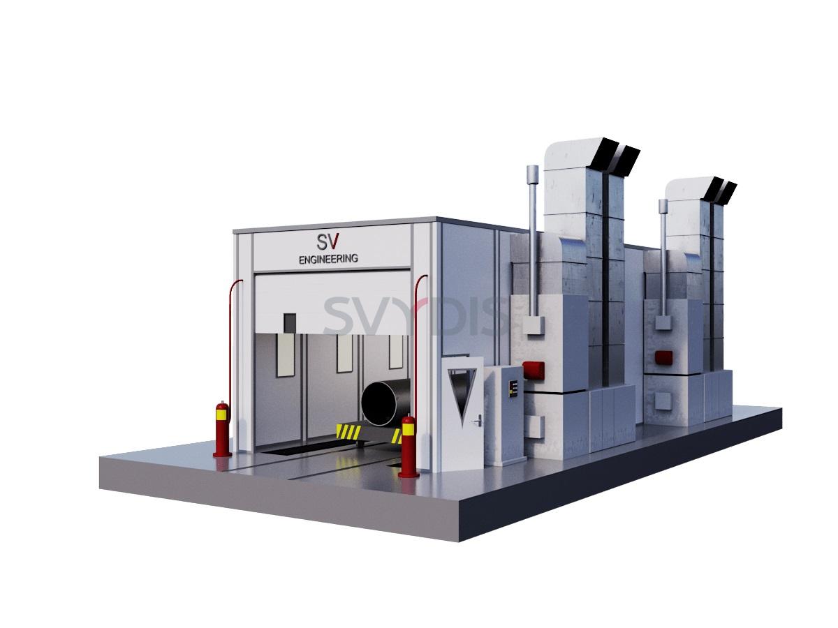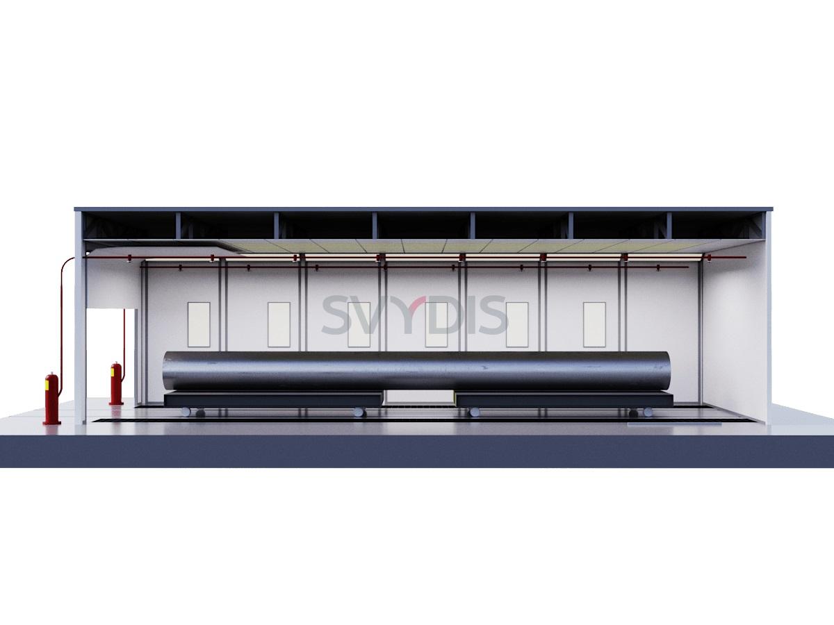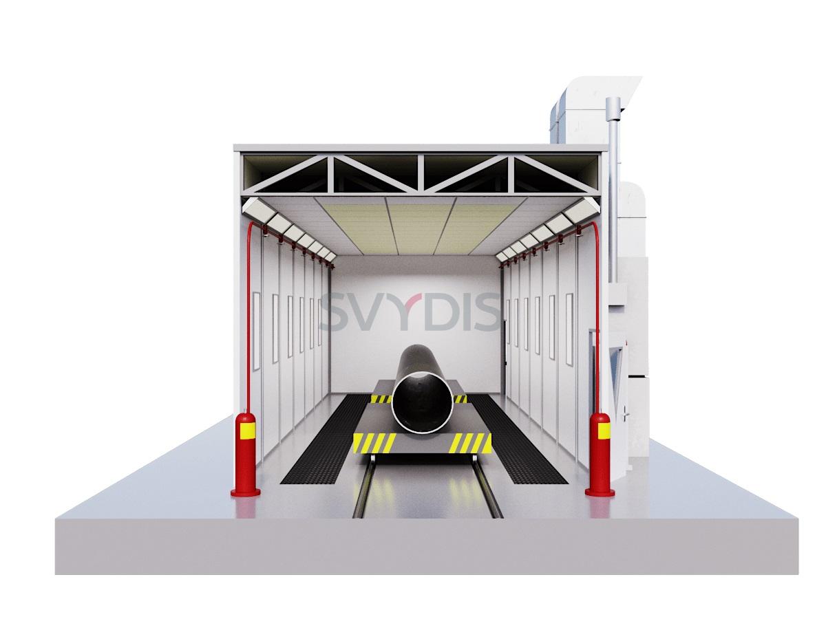 Окрасочно-сушильная камера тупикового типа для труб предназначена для подготовки поверхности, обеспыливания, обезжиривания, маскировки, а также нанесения на изделия лакокрасочных покрытий и их сушке при повышенной температуре.