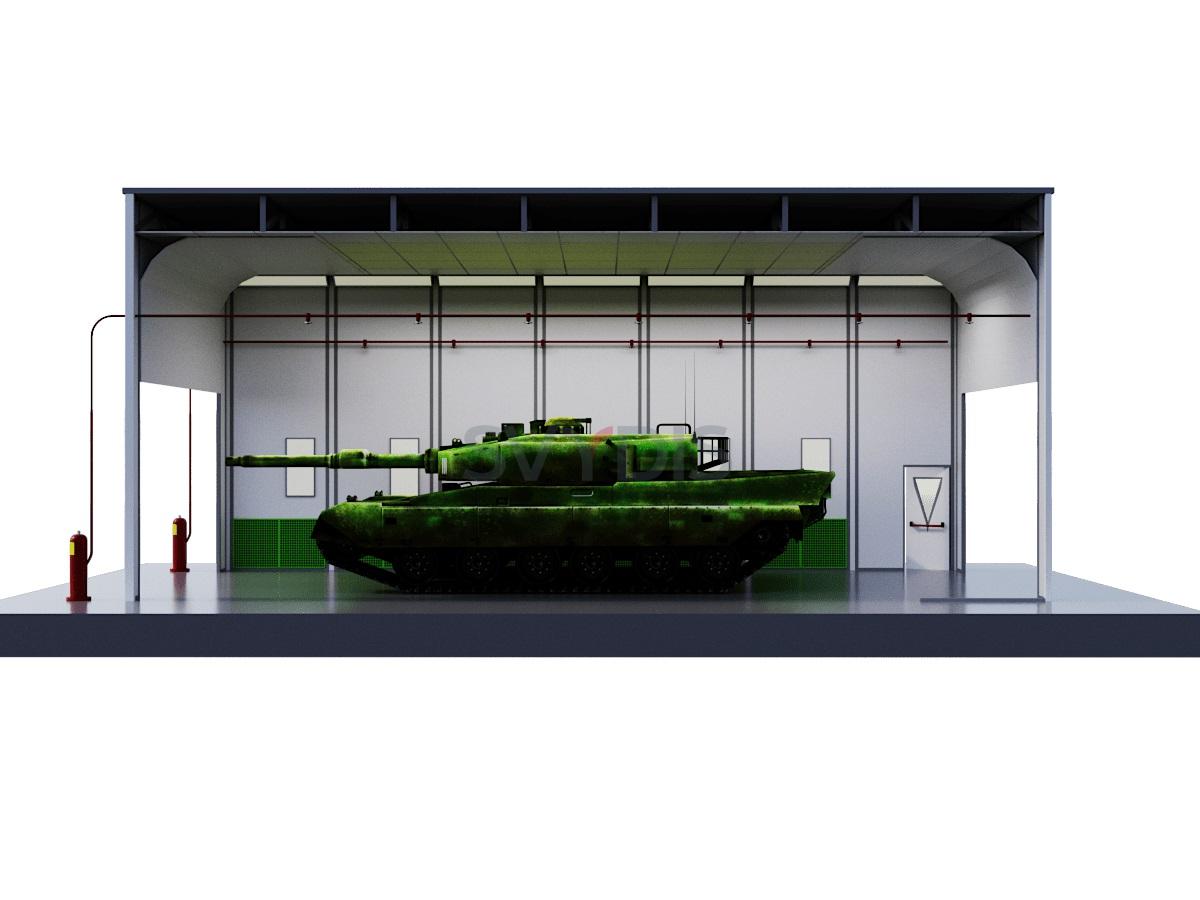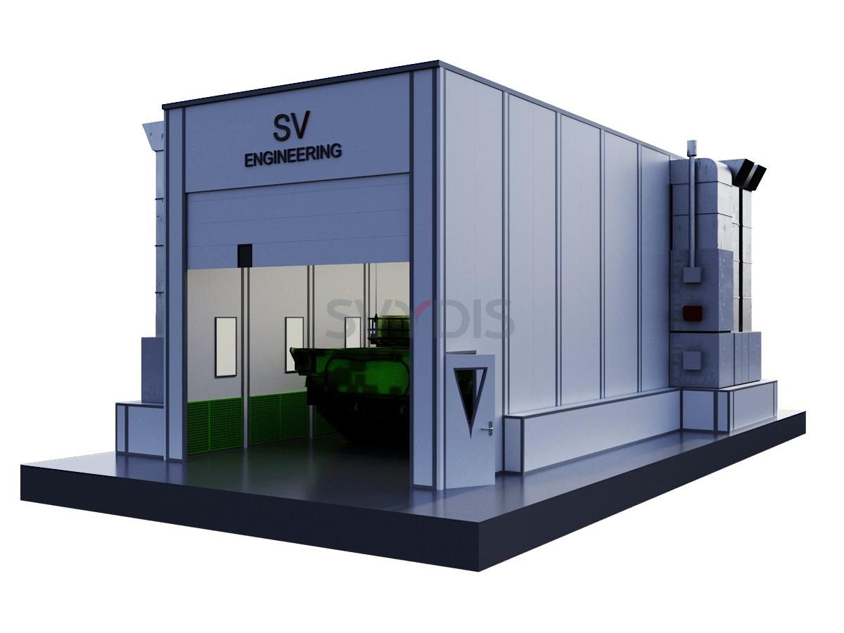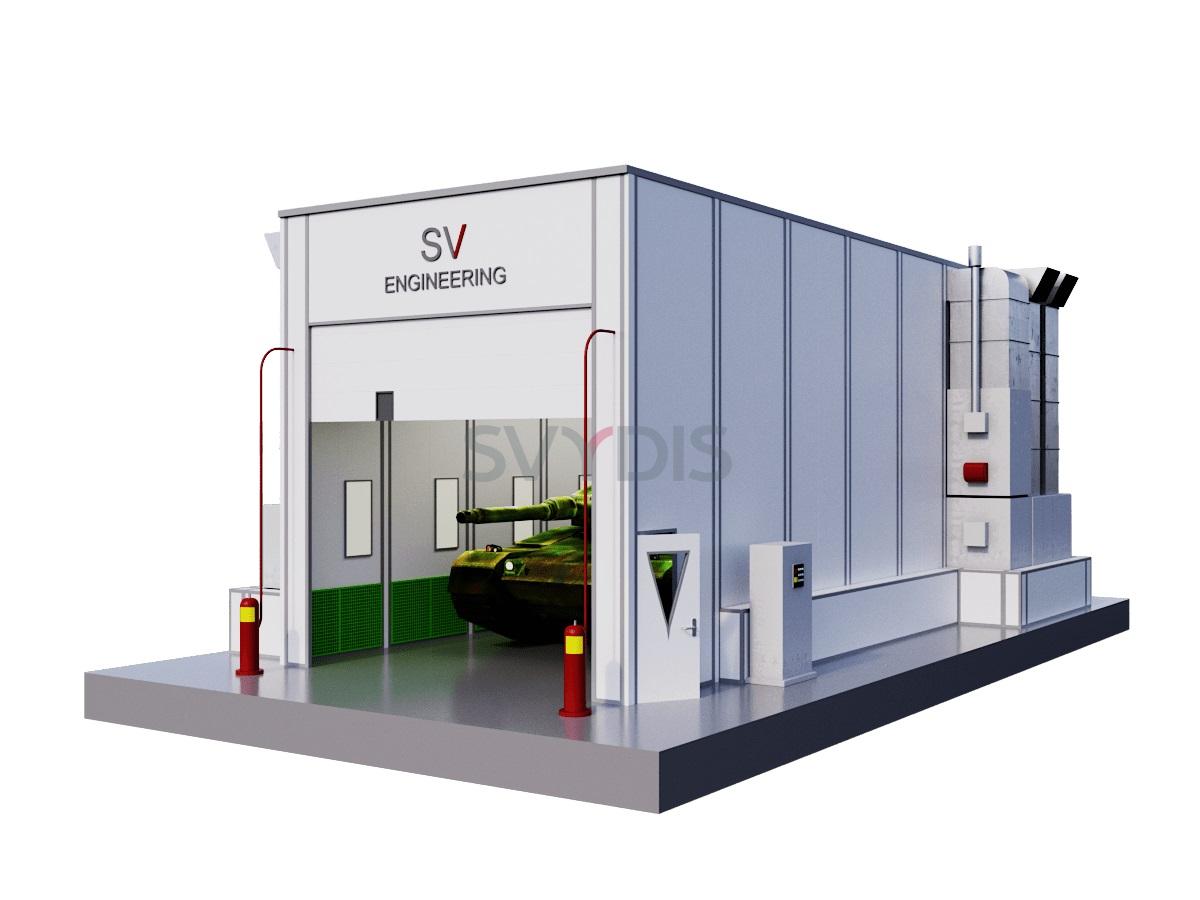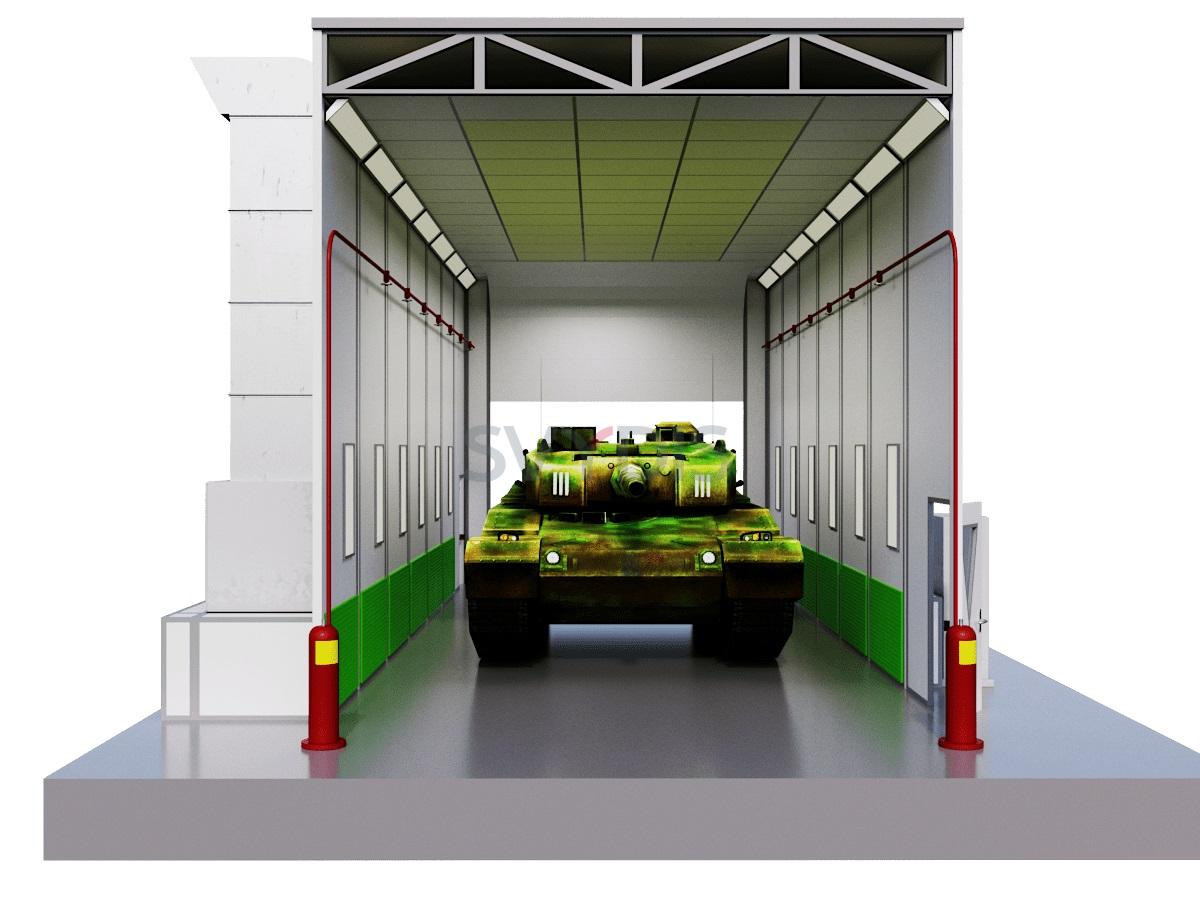 Окрасочно-сушильная камера проходного типа для гусеничной техники предназначена для подготовки поверхности, обеспыливания, обезжиривания, маскировки, а также нанесения на изделия лакокрасочных покрытий и их сушке при повышенной температуре.
